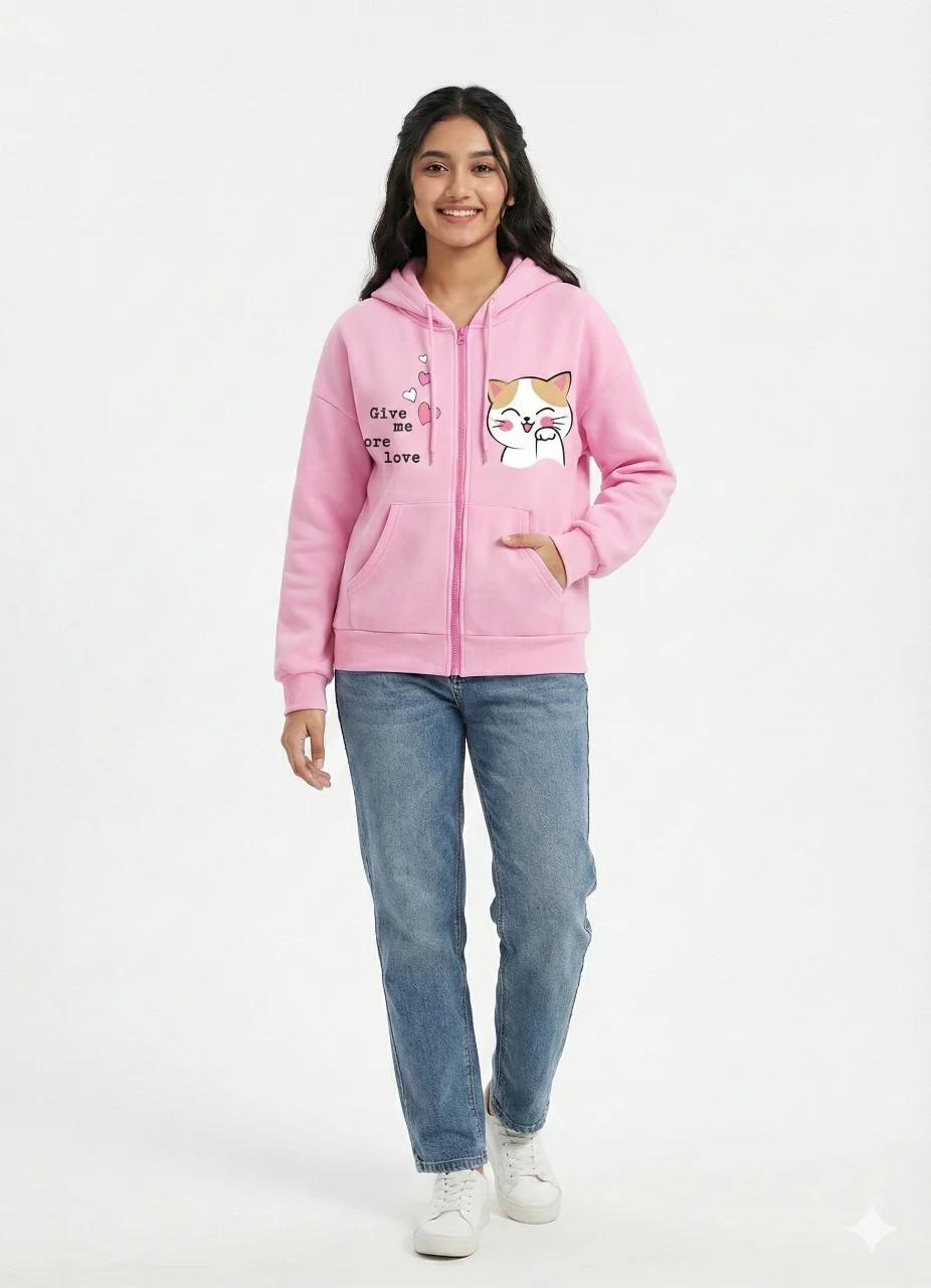Trendy Girls Hoodie – Pink Color – Cat Animation Design